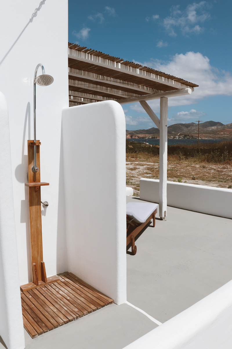 The suite also features an outdoor shower overlooking the sea, perfectly positioned for enjoying the best daily sunsets.